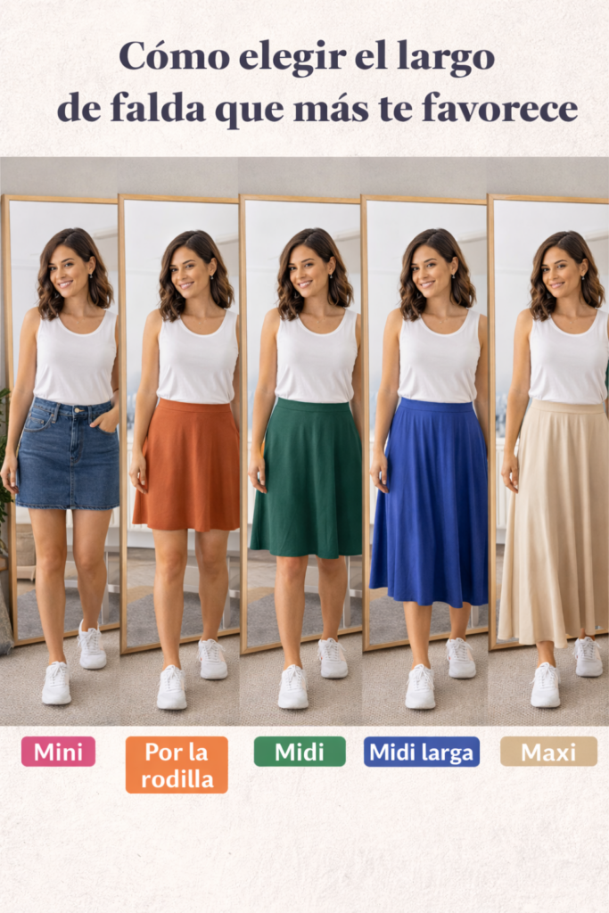 Las faldas por la rodilla o midi (terminando en punto estratégico) son muy favorecedoras. Evita el largo a media pantorrilla que corta la pierna en su punto más ancho.